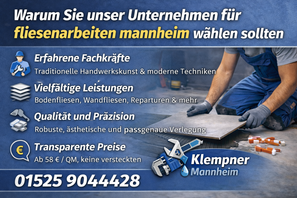 Schnelle, zuverlässige und hochwertige Fliesenarbeiten Mannheim sind jetzt direkt verfügbar. Ob gebrochene Fliesen, beschädigte Fugen oder Renovierungen – Klempner Mannheim bietet Ihnen fachgerechte Unterstützung, damit Ihre Böden, Wände und Terrassen wieder sicher, funktional und optisch ansprechend sind. Unser erfahrenes Team setzt moderne Techniken, hochwertige Materialien und präzise Ausführung ein, damit Ihre Fliesenprojekte langlebig und makellos umgesetzt werden. Profitieren Sie von unserem Express-Service, transparenter Preisgestaltung ab 58€ und garantierter Qualität – schnell, professionell und ohne versteckte Kosten.