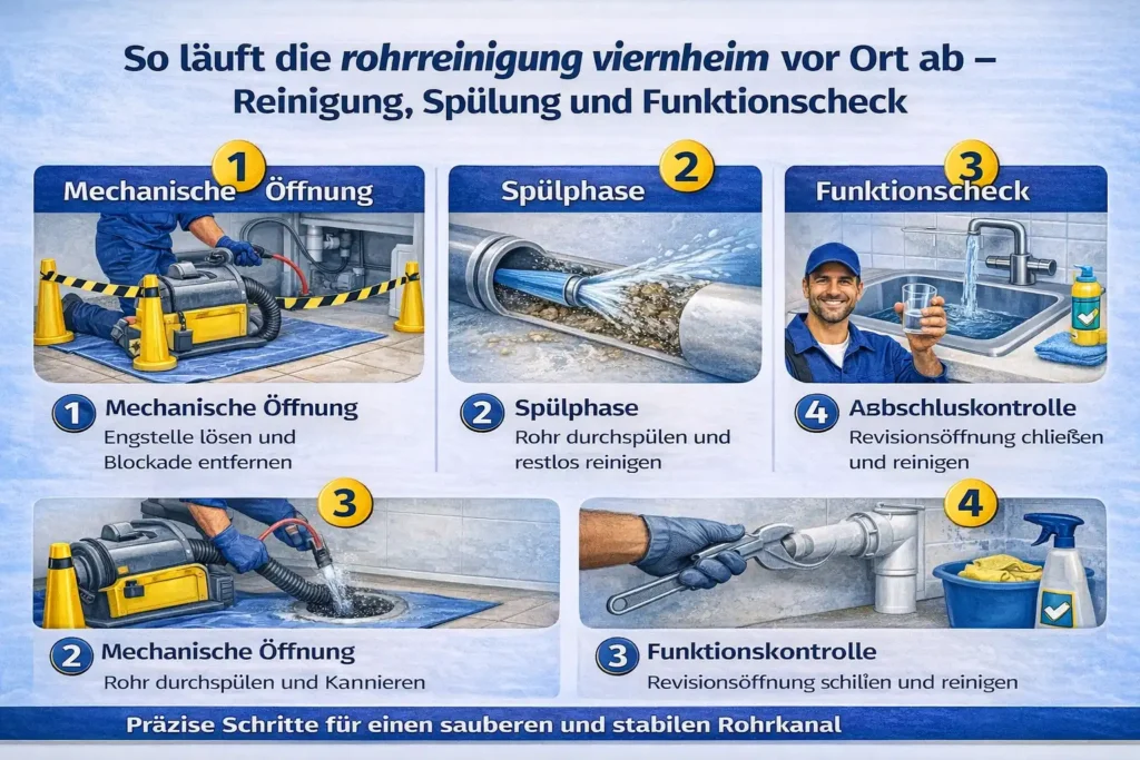 Eine professionelle Rohrreinigung folgt einem strukturierten Prozess, der mit einer sorgfältigen Analyse beginnt und mit einer sauberen und funktionierenden Leitung endet. Transparenz und Kommunikation mit dem Kunden stehen dabei im Vordergrund.