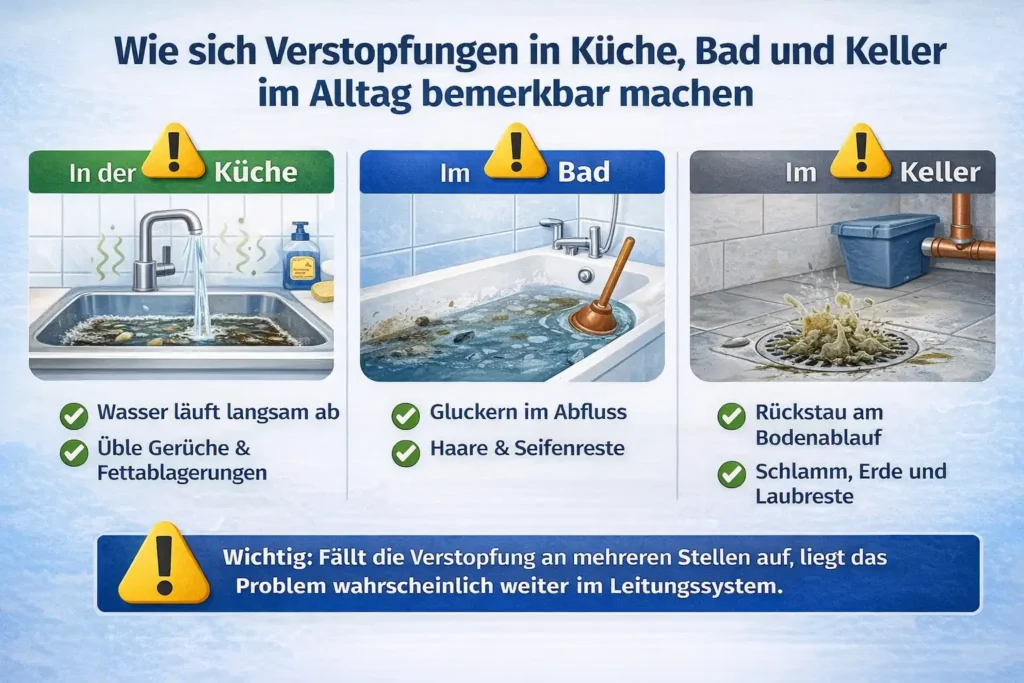 Wie sich Verstopfungen in KĂĽche, Bad und Keller im Alltag bemerkbar machen
